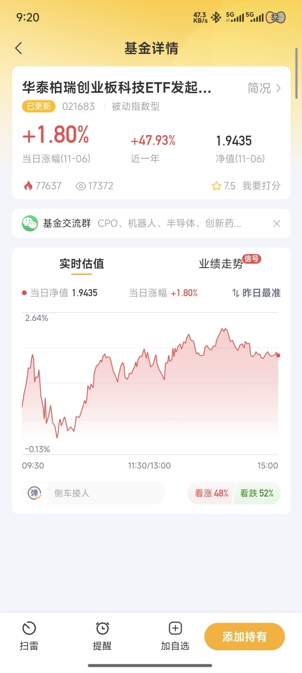 创业板指今天的行情是不是让你觉得科技板块有机会?要是你想参与又怕选个股翻车,华泰柏瑞是个好选择。它紧紧跟着创业板科技板块,今天涨了1.8%,近一年涨了47.93%!就像坐顺风车,板块涨它就跟着涨,不用你天天盯盘研究。对于咱们这些想在科技赛道分杯羹,又不想承担单只股票高风险的投资者,买它准没错,稳稳的,还很省心。