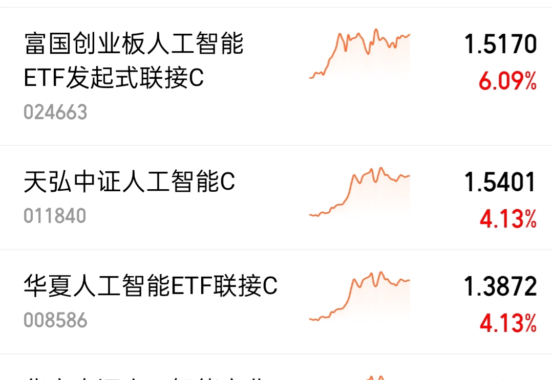 最近科技类板块修复的很快,有些甚至创了新高$富国创业板人工智能ETF发起式联接C$ 涨6个多,$平安中证人工智能主题ETF发起式联接C$ 涨4个多,$华夏人工智能ETF联接C$ 也涨4个多,真的是牛逼起来了