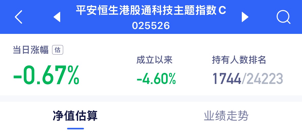 今天A股三大指数微跌,港股同步走弱,恒生指数跌0.71%、恒生科技指数跌0.96%。$平安恒生港股通科技主题指数C$预计回调0.67%,紧密跟踪标的指数,90%以上资产聚焦港股通科技龙头,类免申购费,借半导体等结构性机会分散风险,适配中长期布局,精准把握AI产业变革红利