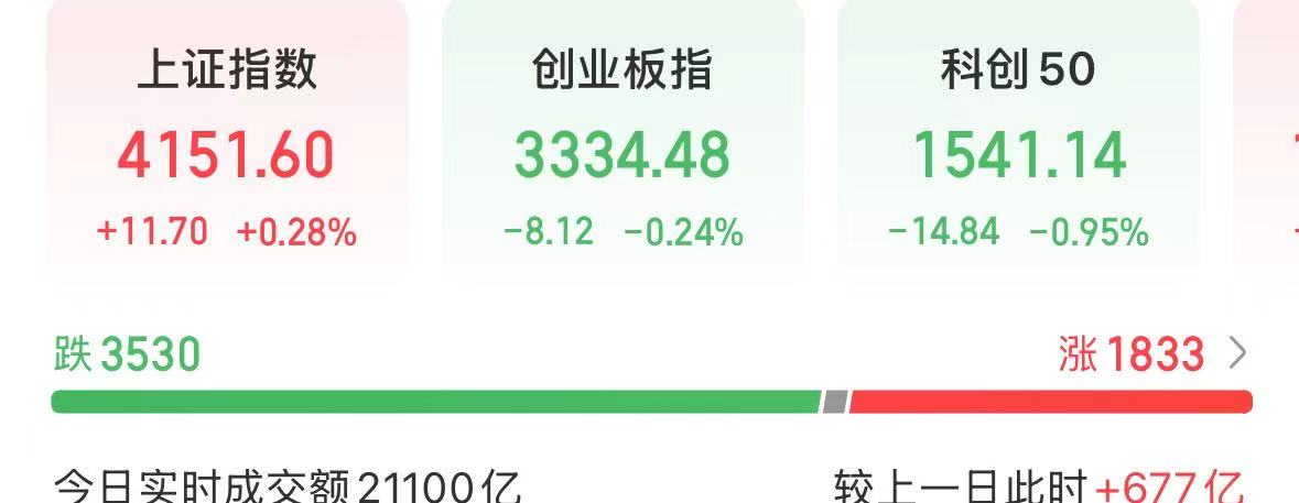 盘面上,截至我发文,上证指数上涨0.28%,创业板指数下跌0.24%,科创50下跌0.95%
