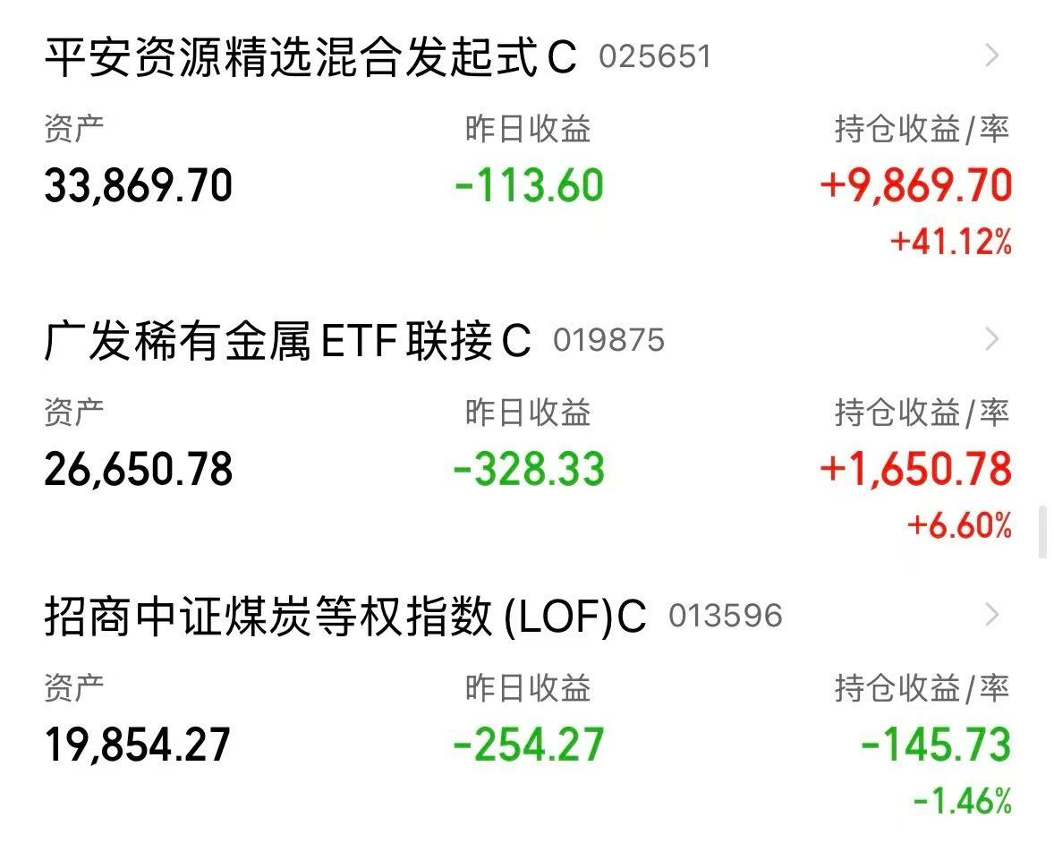 今天有色、煤炭、石油都大涨,我今天不动,近期主要加了煤炭,有色和资源之前布局了一些,布局的还不够,下次还是要更敏感,布局的快一点,我觉得目前资源有色还在前半程,如果回踩我再加大配置$广发稀有金属ETF联接C(OTCFUND|019875)$