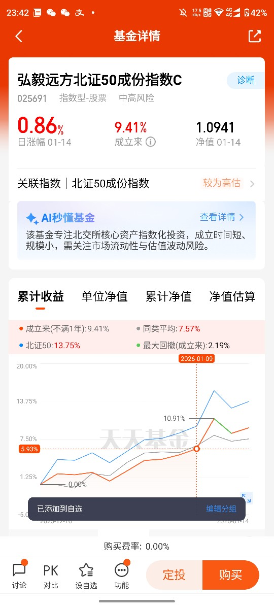 在费率方面,弘毅远方北证50成份指数A作为指数基金,管理费率和托管费率处于行业低位,长期持有能够有效减少费用成本对收益的侵蚀 ;同时,基金为普通开放式产品,每个开放日均可申赎,流动性良好,满足投资者灵活配置的需求。需要注意的是,该基金为股票型指数基金,预期风险和收益高于混合型、债券型基金,且主要投资于北交所股票,可能面临流动性风险、股价波动风险等,但对于风险承受能力中等以上、看好北交所长期发展的投资者而言,这些风险正是获取超额收益的必要对价。