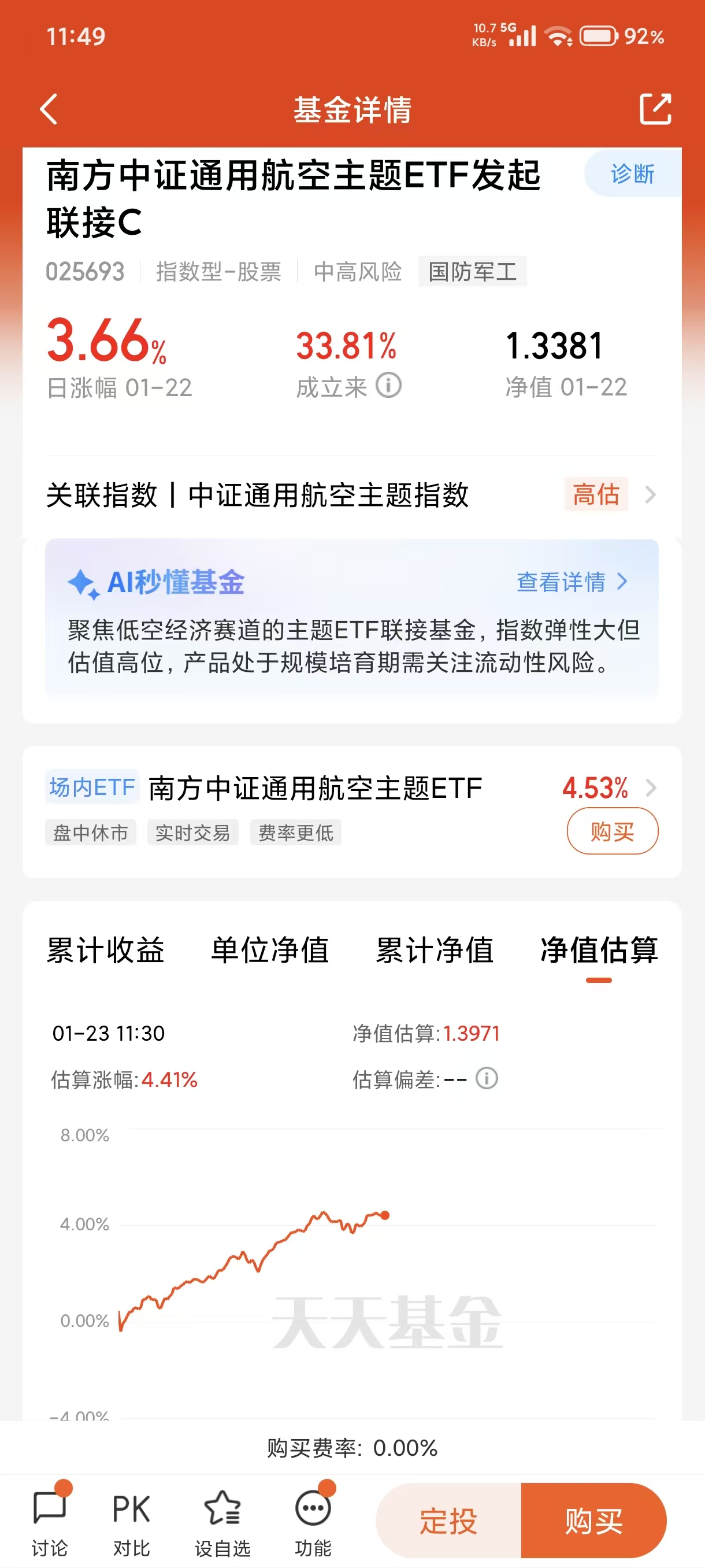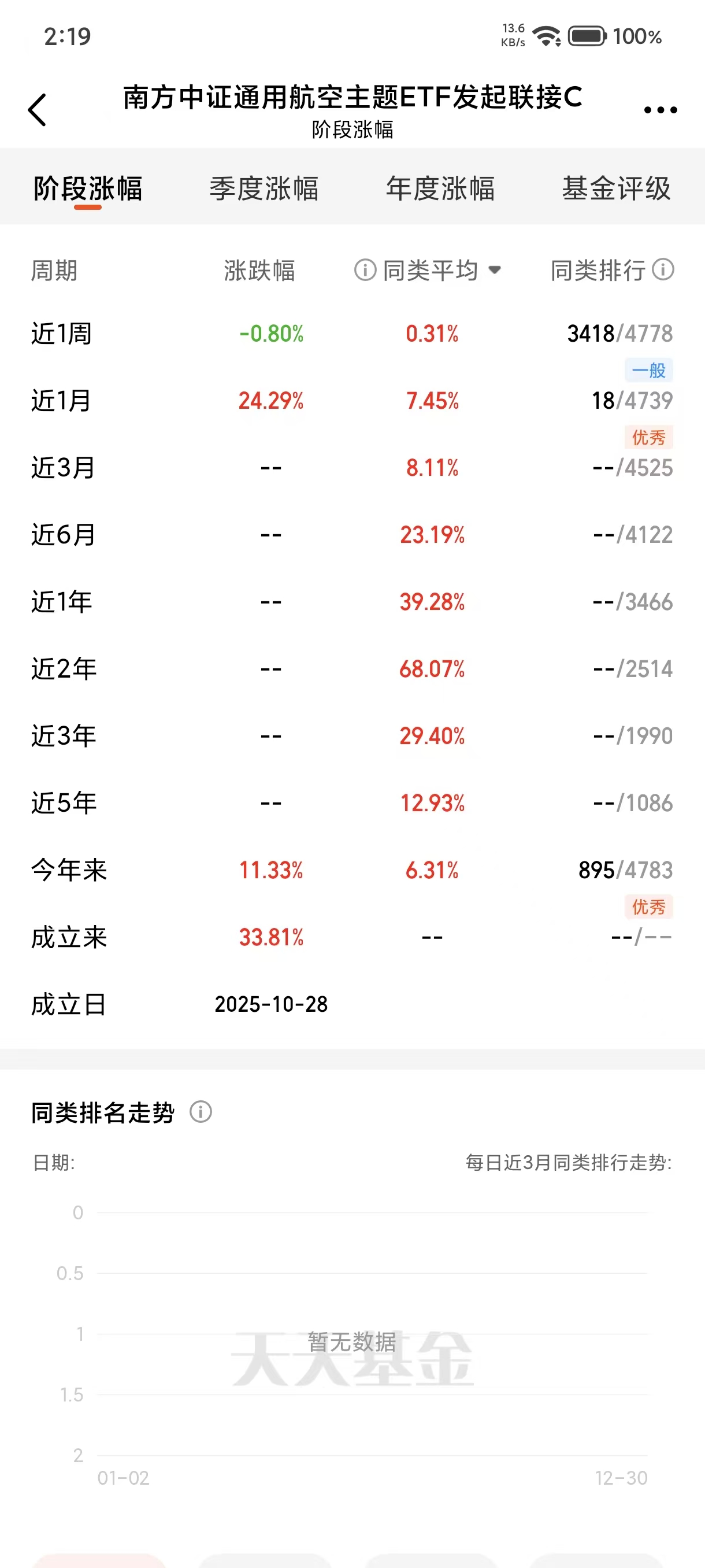 这只基金最大的投资逻辑在于牢牢把握低空经济的国家级战略机遇,自成立以来收益超过33%,大幅跑赢同类平均,今天基金净值有望突破4%。随着商业航天以及低空经济的快速发展,这只基金有望迎来一波行情,我后续会持续加仓,长期看好这只基金的表现。