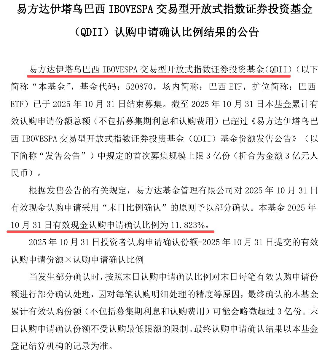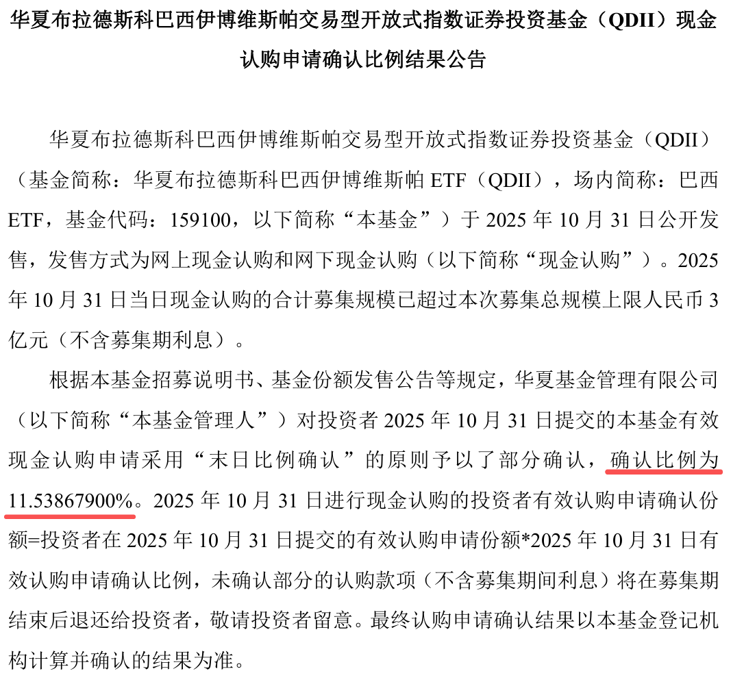 易方达基金旗下的巴西ETF(520870)配售比例11.823%,华夏基金旗下的巴西ETF(159100)配售比例11.53867900%,很接近,都很低。