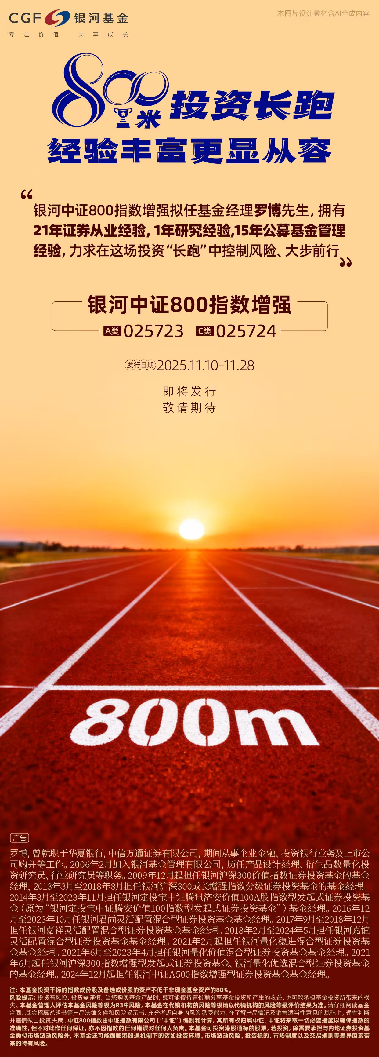 银河中证800指数增强拟任基金经理罗博先生,拥有21年证券从业经验,1年研究经验,15年公募基金管理经验,力求在这场投资“长跑”中控制风险、大步前行。