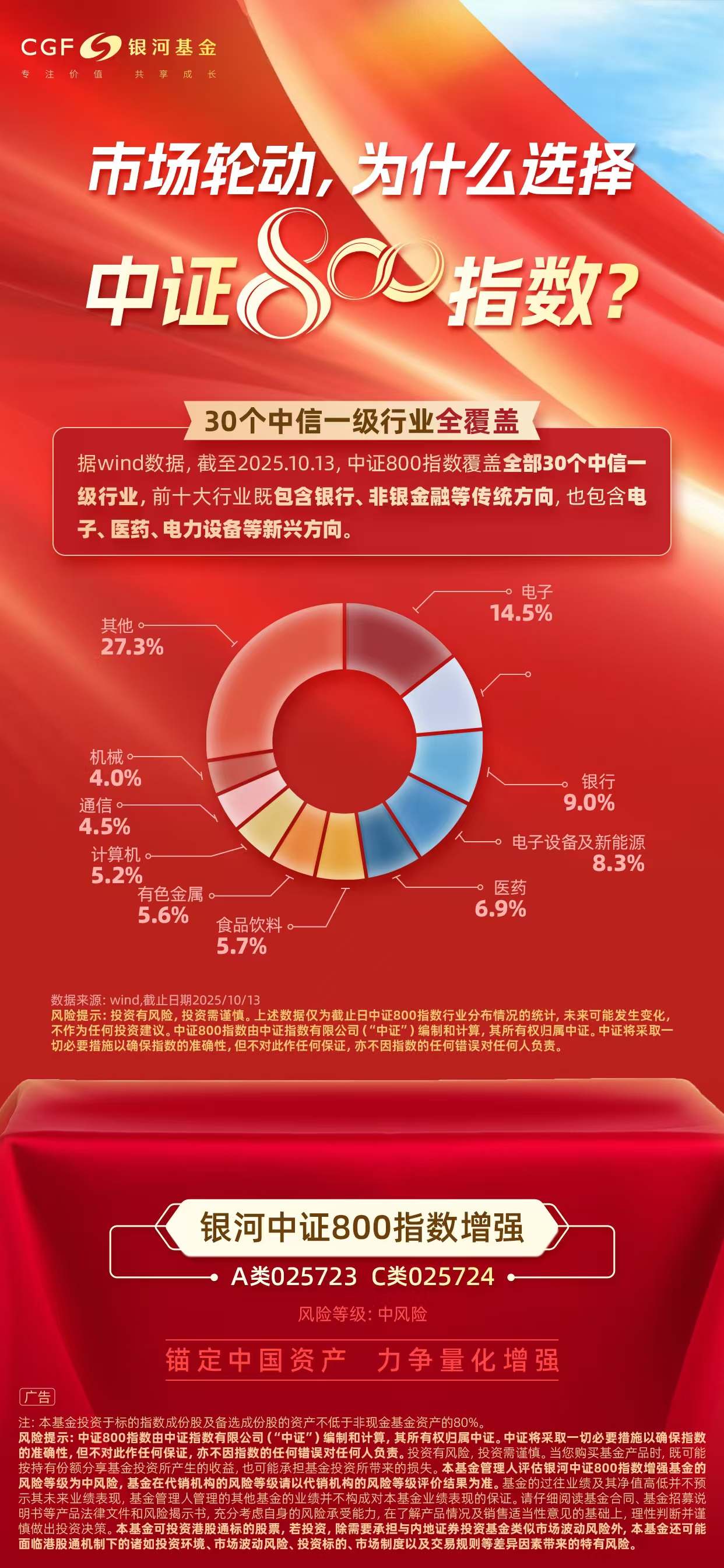 据wind数据,截至2025.10.13,中证800指数覆盖全部30个中信一级行业,前十大行业既包含银行、非银金融等传统方向,也包含电子、医药、电力设备等新兴方向。