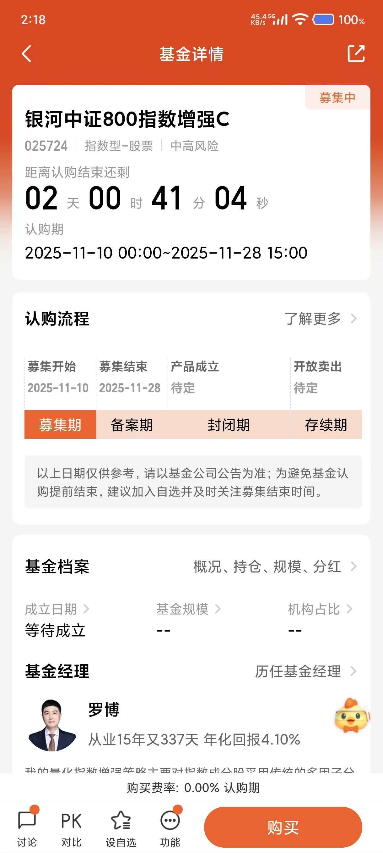 今天我选择加仓3000元银河中证800指数增强C(025724),它是一只正在发行的指数增强型基金。这只基金跟踪的中证800指数由沪深300指数(大盘蓝筹)和中证500指数(中盘成长)的成分股共同构成,共计800只股票,覆盖了A股市场最具代表性的各行业龙头公司,能够较为全面地反映中国经济的整体状况。$银河中证800指数增强C(OTCFUND|025724)$