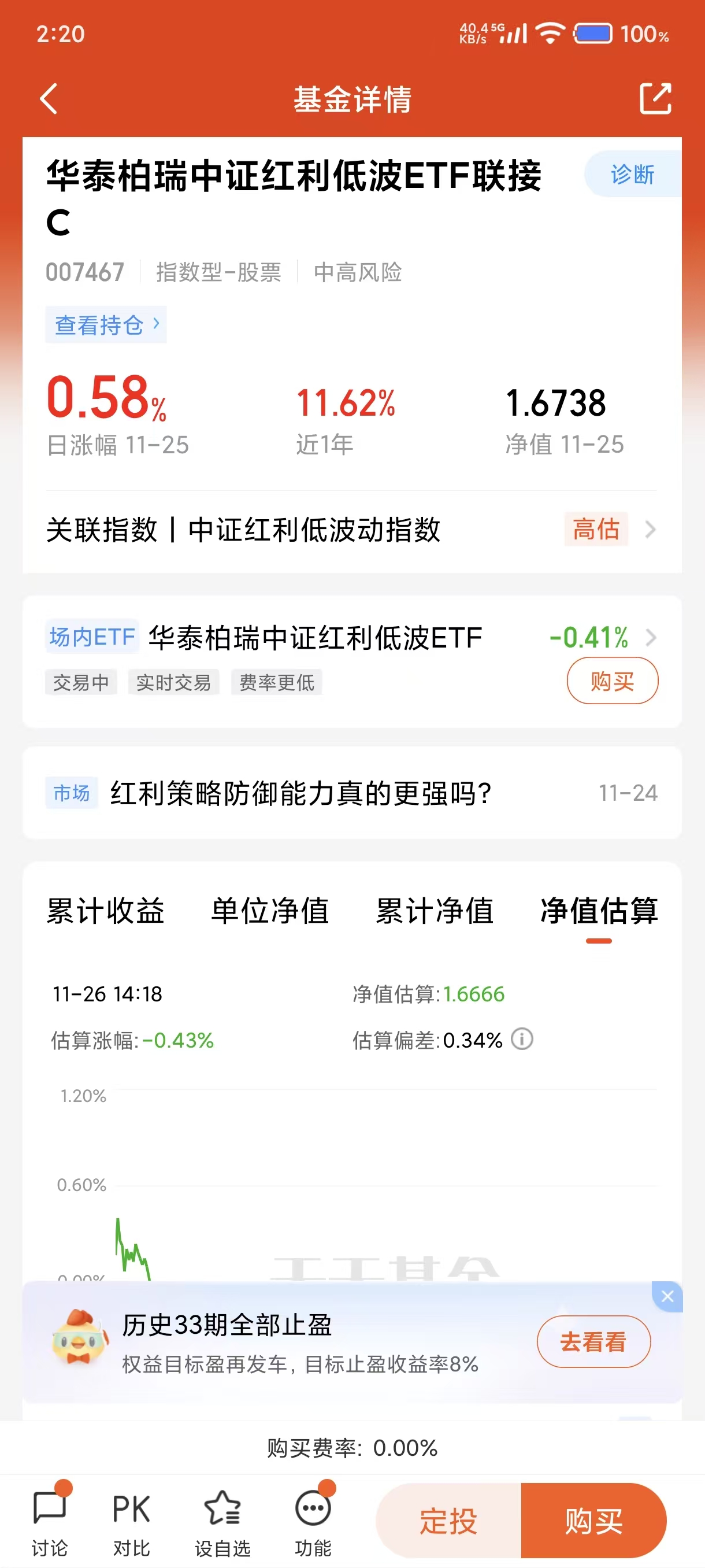 我今天选择加仓1000元华泰柏瑞中证红利低波ETF联接基金C(007467),跟踪的是中证红利低波指数,选取的是现金股息率高、分红稳定的上市公司,高股息率特性使得它在市场下跌时吸引避险资金流入,而且基金已经连续26个月分红了,总之这只基金不仅回撤小,赚钱效应好,还有分红,我会持续加厚仓位,长期看好它的表现。$华泰柏瑞中证红利低波ETF联接C(OTCFUND|007467)$