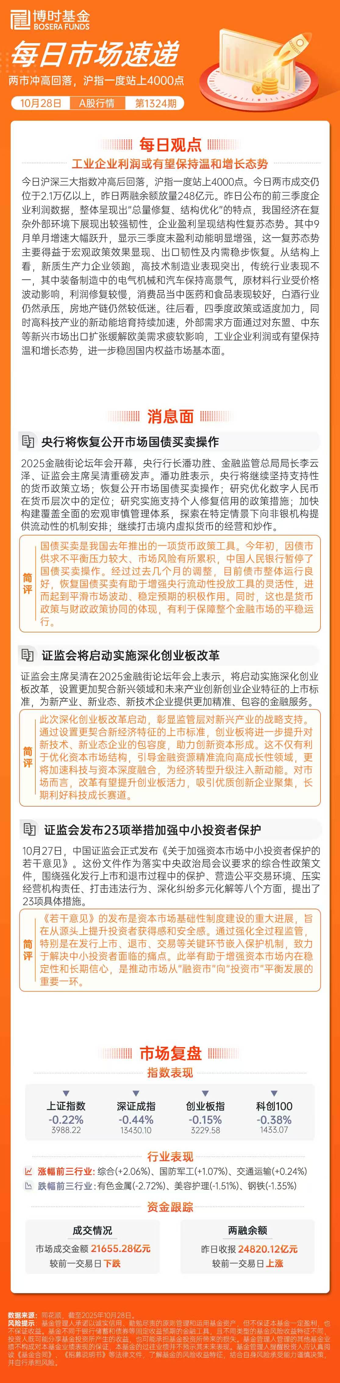 【博时市场点评10月28日】两市冲高回落,沪指一度站上4000点