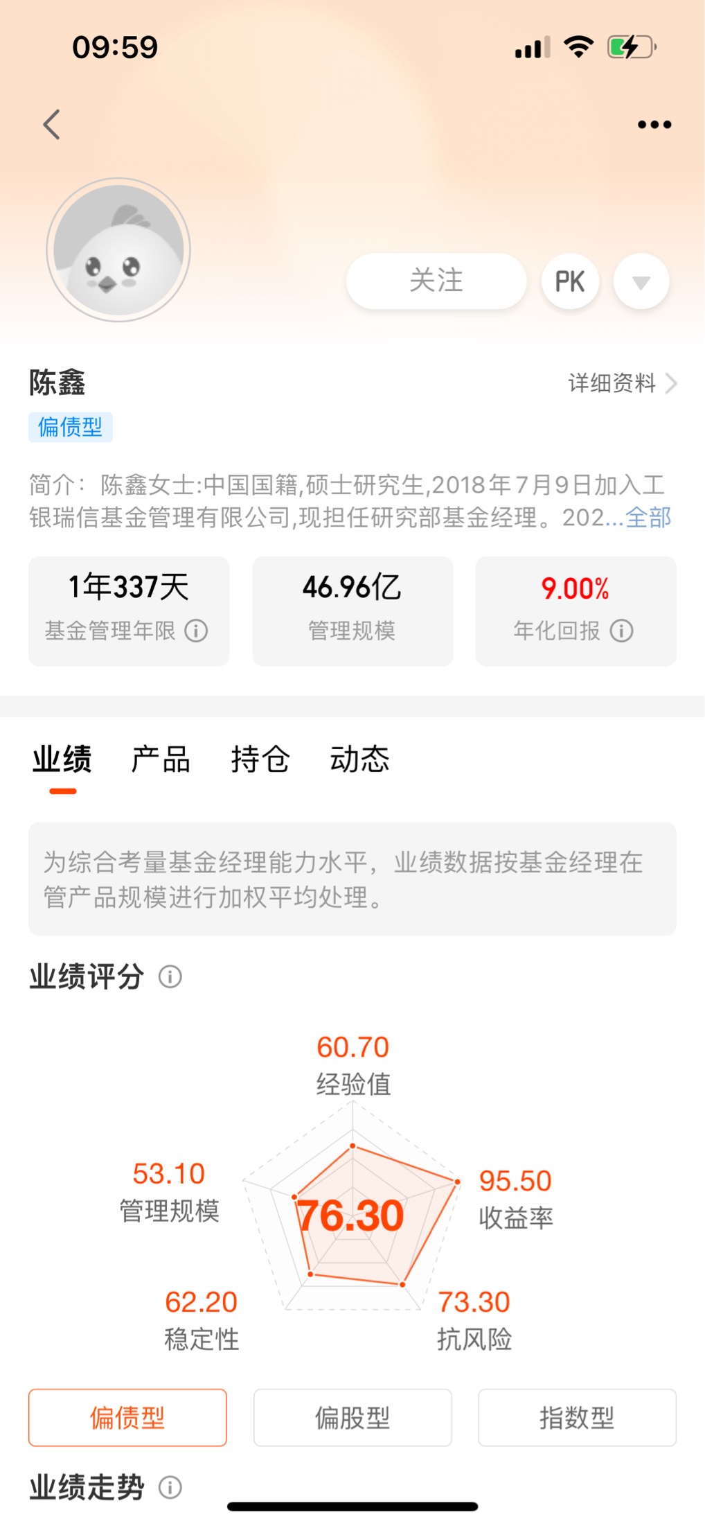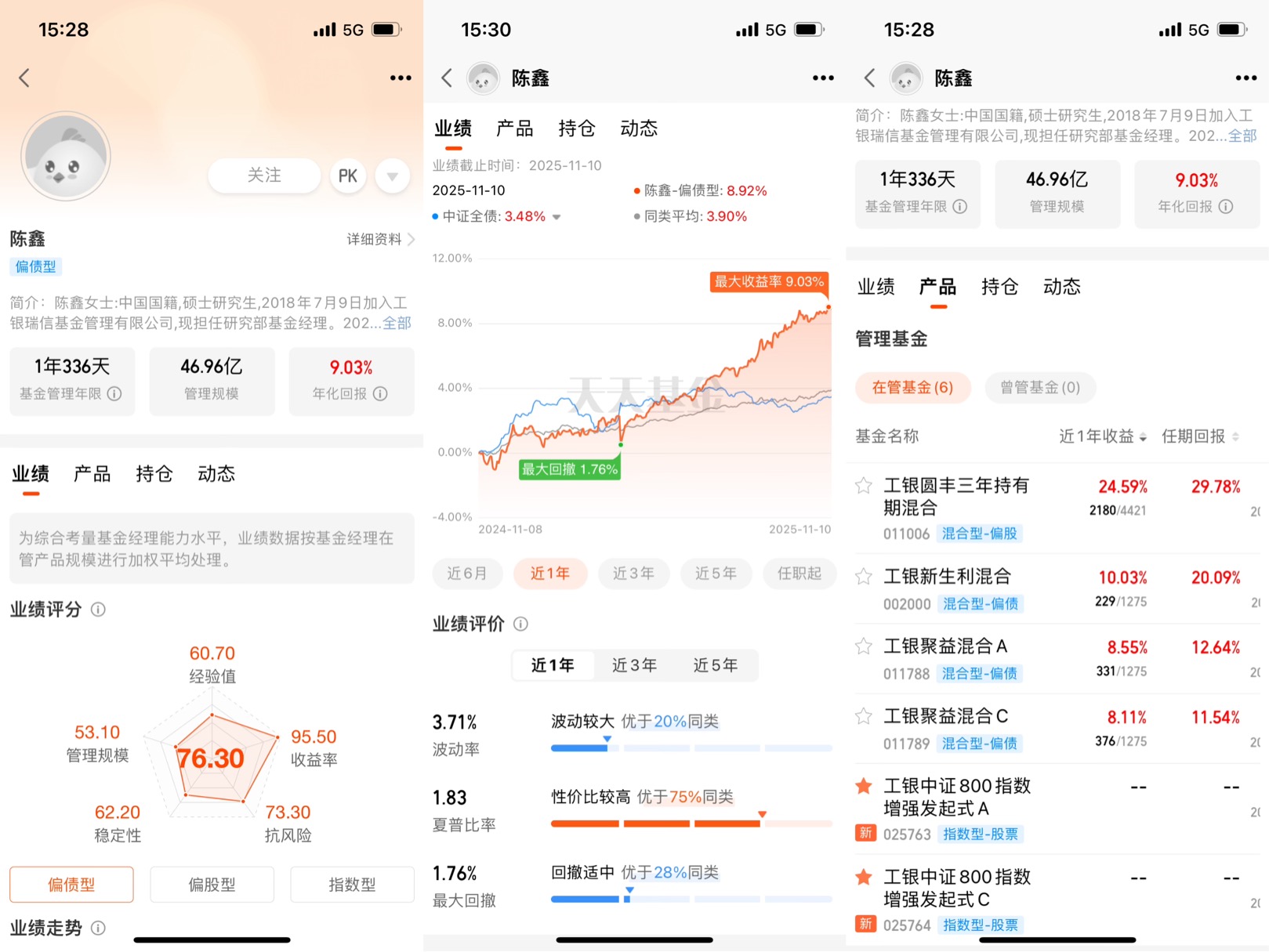 还有,基金经理陈鑫也让我放了心。别看她从业才1年多,但她是北大金融数学硕士,现在是工银量化团队的负责人,之前管的几只混合基金,近1年收益都在8%以上,比同类平均高不少。她的风格是“重纪律、控风险”,用量化模型做风格判断和选股,不会凭感觉加仓减仓,这种“理性派”经理,在震荡市里比“感性派”稳多了,毕竟现在的市场,“不亏”比“多赚”更重要。