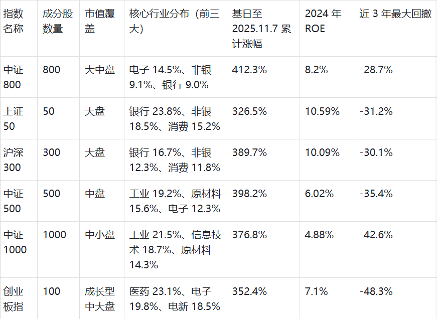 表 1:主流宽基指数核心指标对比(截至 2025 年 10 月)