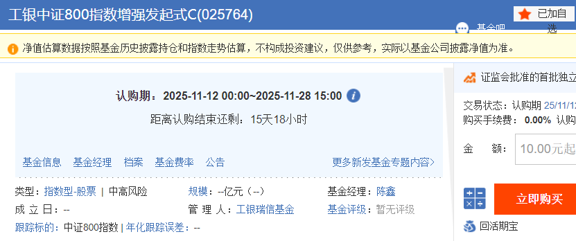 工银中证 800 指数增强发起式 C 是工银瑞信基金于 2025 年 11 月 12 日起公开发售的股票型指数增强基金,A 类代码 025763,C 类代码 025764。基金以中证 800 指数为业绩比较基准,在控制跟踪误差的基础上,通过量化增强策略追求超额收益。