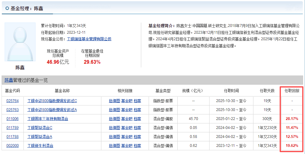 她目前管理着工银瑞信新生利混合、工银瑞信圆丰三年持有期混合等产品,其中我持有的圆丰三年持有期混合,在她管理期间风格很稳健。另外从她团队的整体表现看,之前管理的同类指数增强产品,曾做到成立后累计收益超基准 4.82 个百分点,近六个月收益排同类前 25%,年化波动率比中证 800 指数还低,最大回撤也比基准小,能看出她在风险控制和超额收益获取上都有一套方法。