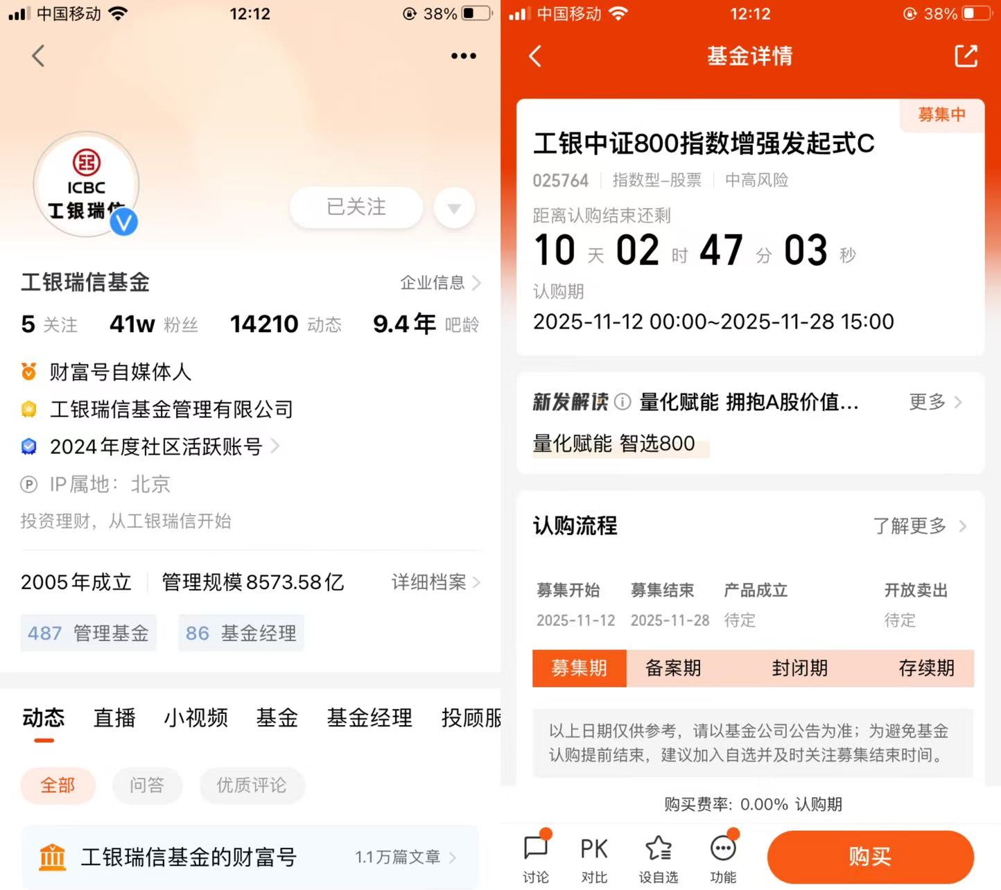 它是一只股票型指数增强发起式基金,基金代码A 类 025763$工银中证800指数增强发起式A(OTCFUND|025763)$、C 类 025764$工银中证800指数增强发起式C(OTCFUND|025764)$,募集期到 11 月 28 日。跟踪的中证 800 指数很有特点,把沪深 300 的蓝筹股和中证 500 的成长股都囊括了,市值覆盖率超 A 股总市值的 75%,行业分布也均衡,既有金融、消费这类成熟行业,也有医药、电子等成长赛道,能兼顾大盘的稳健和中盘的弹性。而且它作为发起式基金,基金管理人会自投不少于 1000 万元并锁定三年,这一点挺让人安心,相当于管理人跟投资者利益绑在了一起。不过要注意,它长期风险和预期收益都高于混合型、债券型基金,要是投了港股通标的,还得承担相关的市场差异风险。