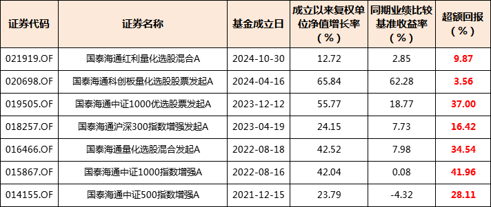 统计发现国泰海通资管旗下成立在一年以上的指数增强基金都实现了相较于指数的超额回报。