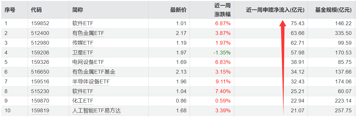 在宽基ETF遭遇抛售的同时,行业ETF成为资金布局的核心方向,软件、有色金属、卫星、半导体设备等科技赛道的表现尤为亮眼。其中,软件ETF(159852)、有色金属ETF(512400)和传媒ETF(512980)单周净申购位列前3名,净流入金额均超过60亿元。