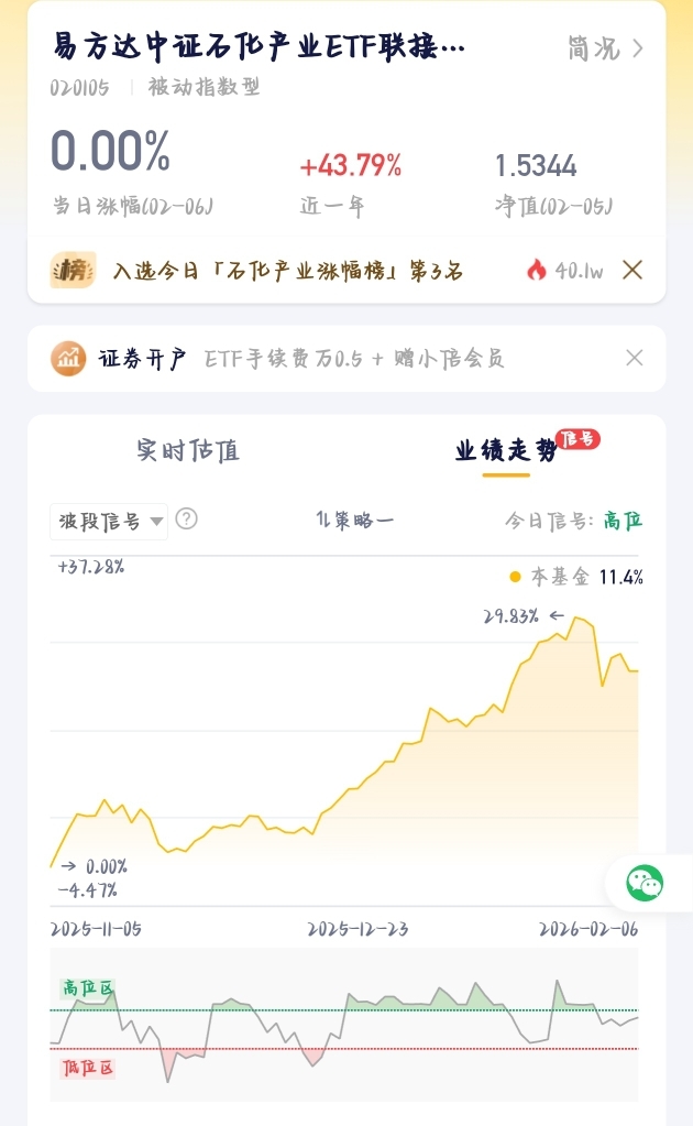 近期化工板块强势反弹,供需改善+产品涨价带动板块持续走强,资金持续流入,易方达化工行业ETF联接C$ 跟踪中证石化产业指数,覆盖石油石化、基础化工龙头,高股息与周期弹性兼备,成分股集中度高、走势更稳。指数紧跟行业景气,反弹力度足,低位调整就是布局窗口,把握周期回暖与估值修复机会,紧跟板块行情更省心。