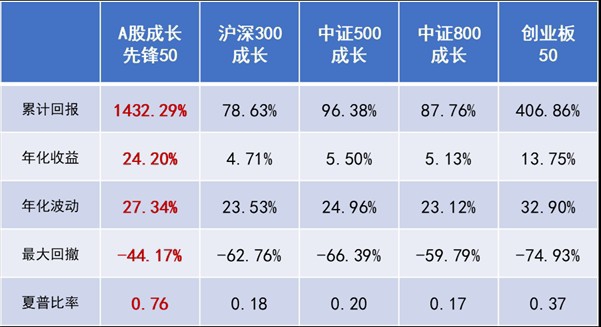 以和基金关注方向相似的华证成长先锋50指数为例,从2012年底到2025年底,它的累计回报高达1432.29%,年化收益24.20%,而沪深300成长指数年化只有4.71%,创业板50也才13.75%。更关键的是,它的风险控制还更优——最大回撤只有-44.17%,远低于沪深300成长的-62.76%和创业板50的-74.93%。
