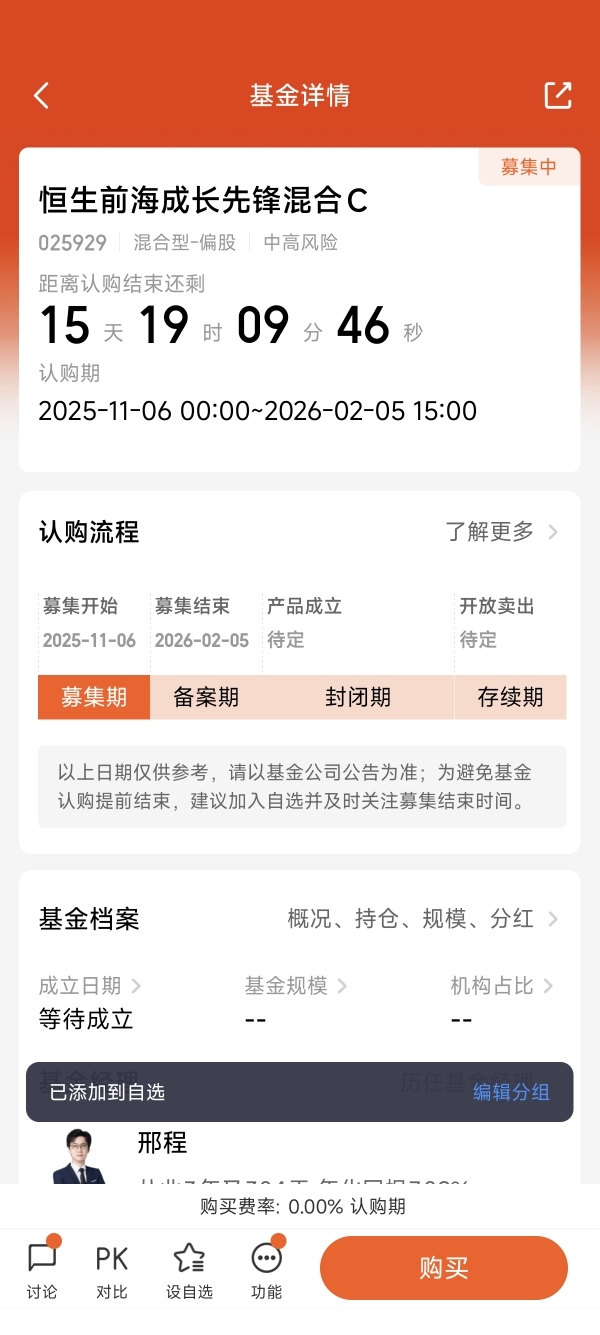 基金由龙江伟和邢程两位经理共同管理。虽然这是一只新基金,他们暂无历史业绩可考,但看他们的履历:一位有深厚的制造/周期行业研究背景,另一位(邢程)则有丰富的港股通基金(如恒生前海沪港深新兴产业精选混合)管理经验。这种“高端制造+港股成长”的能力圈组合,与我前面看好的2026年科技成长、产业升级主线是比较契合的。