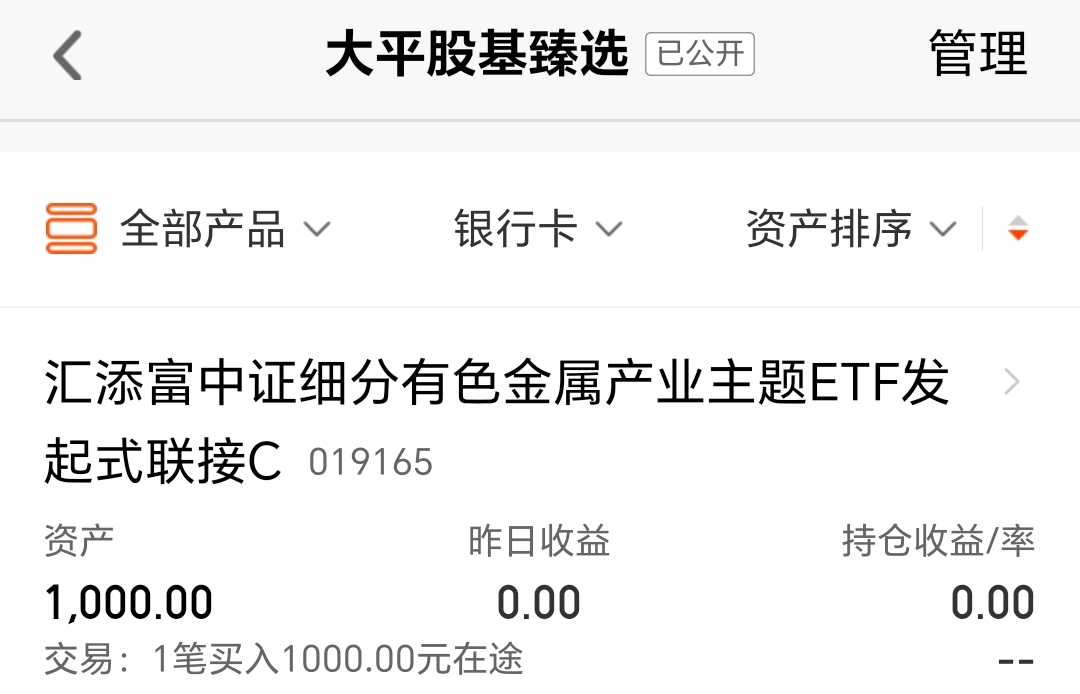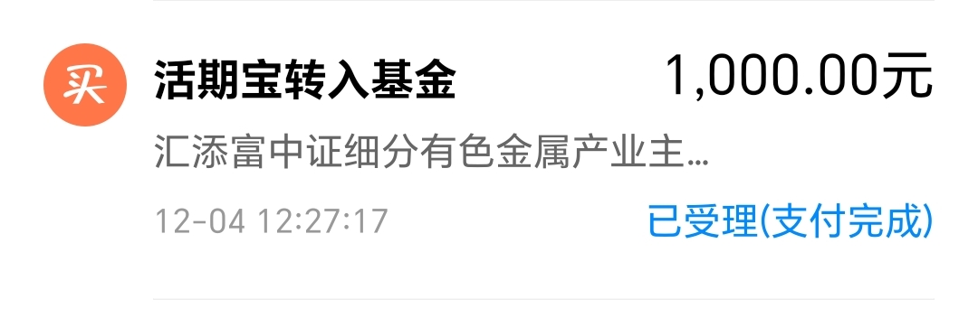 今天我买入$汇添富中证细分有色金属产业主题ETF发起式联接C(OTCFUND|019165)$1000块钱。