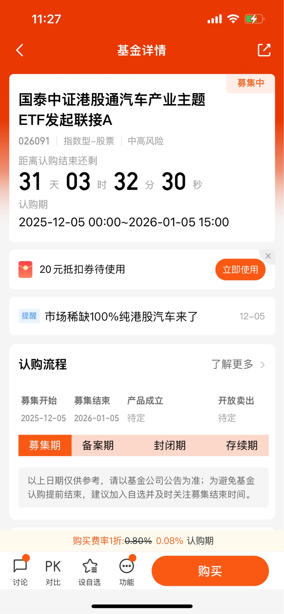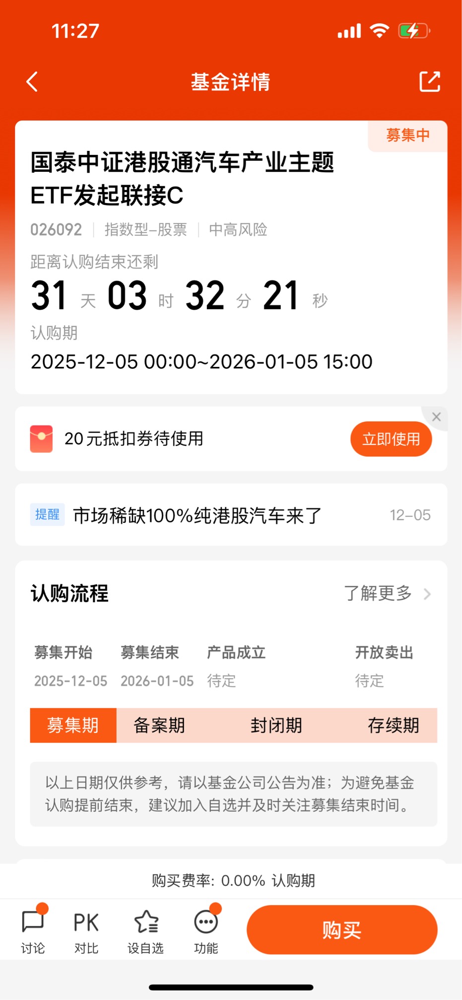 现在买这只基,时机刚好卡在“估值低位+政策红利”上:港股本身经过2025年的调整,估值处于历史低位,而汽车板块又赶上了“智能驾驶政策放开”的节点,2025年底不少城市已经允许高阶辅助驾驶上路,2026年政策只会更松,这会直接带动智驾相关公司的业绩。而且这只基现在还在募集期,等于能“以发行价”拿到筹码,等基金成立后建仓,刚好能赶上2026年初的新车发布潮(各大车企都会推智驾新车型),情绪面和基本面能形成共振,赚钱的概率比追高要大。