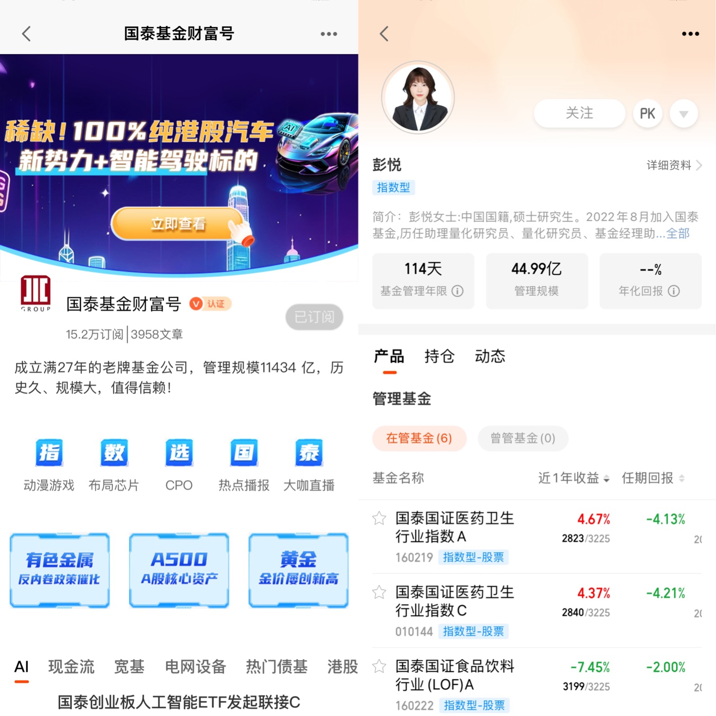 买基金先看公司,国泰基金是1998年成立的老牌公司,管理规模超8200亿,手里500多只基金,光指数型产品就做得很成熟,指数基金最核心的是“跟踪准”,而国泰的量化团队本身就是强项,这只基的投资策略是“完全复制指数成分股”,目标是日均跟踪偏离度不超0.35%、跟踪误差不超4%,大概率不会出现“指数涨了基金不涨”的情况。基金经理彭悦虽然管这只基是新的,但她本身是量化研究员出身,现在管的几只行业指数基(比如医药、食品饮料)跟踪误差都很小,属于“稳扎稳打型”,不用怕新手经理“乱操作”。