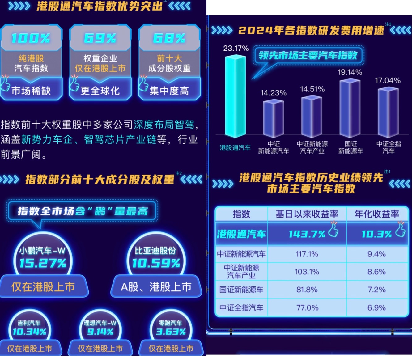 再说说基本面的底气。我翻了下这个指数的业绩,自基日以来涨了143%,年化收益能到10.3%,比中证新能源汽车、国证新能源车这些主流指数都要高。这可不是凭空涨的,港股汽车公司的研发投入增速比行业平均高不少,2024年的研发费用增速直接超过了主要汽车指数。现在新能源汽车早就不是“拼电池”的阶段了,下半场比的是智能化,而港股这批公司刚好踩在了这个点上:前十大权重股里一堆深扎智驾的企业,从新势力车企到智驾芯片产业链都有覆盖,等于把“智能化”这个增长引擎直接装在了指数里。你想啊,现在买车谁不看辅助驾驶?谁不关心车机系统?这些技术背后的公司,不就是接下来的红利受益者吗?
