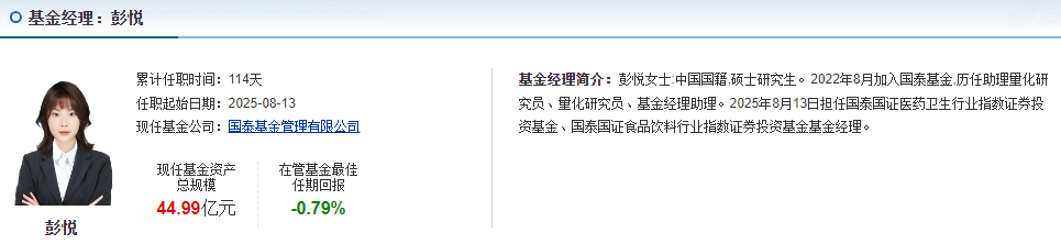 基金经理彭悦女士虽然管过医药、食品饮料,但她的量化研究背景正好契合指数基金的管理需求,加上国泰基金的投研实力背书,跟踪误差能控制得更稳,不用操心主动管理的风格漂移。