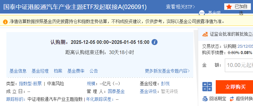 $国泰中证港股通汽车产业主题ETF发起联接A(OTCFUND|026091)$