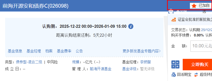 分析基金之前,咱们先把基础信息捋清楚,毕竟知己知彼才能百战不殆。前海开源安和债券C是前海开源基金管理有限公司旗下的一只债券型基金,基金代码026098,成立于2024年3月19日,截至2025年12月31日,基金规模为2.13亿元(数据来源:基金2025年四季报)。从产品定位来看,这只基金属于中低风险的债券型产品,风险等级为R2(中低风险),不过要注意的是,2025年10月前后,前海开源基金旗下多只债券基金经历了风险等级重估,好在这只安和债券C并未在调整名单中,风险等级保持稳定(数据来源:前海开源基金2025年10月公告)。