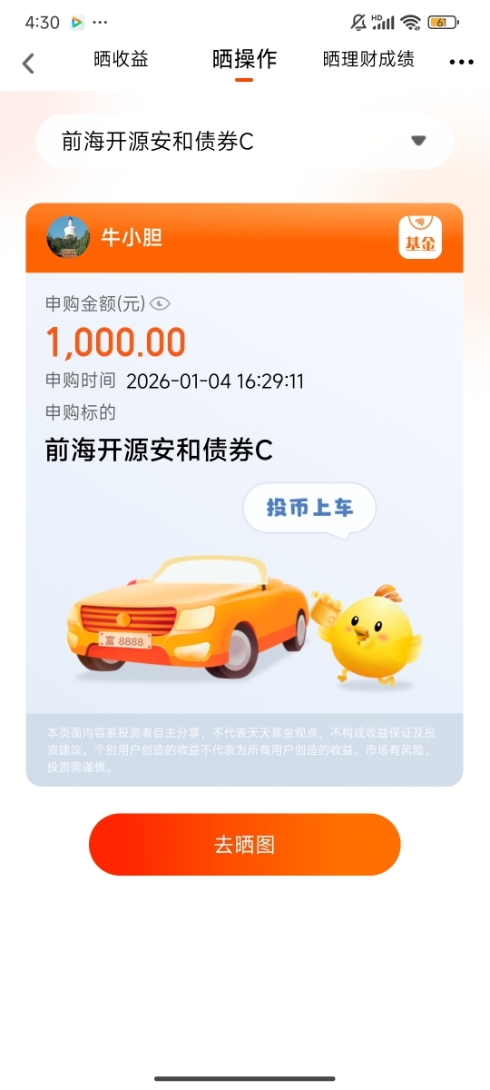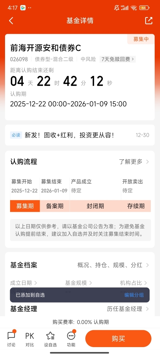 就在我反复琢磨,如何搭建一份“攻守兼备”的投资组合,既能守住现有收益,又能应对未知风险时,前海开源安和债券C(026098)$前海开源安和债券C$这只新发基金,闯入了我的视野。它主打的“固收+红利”双轮驱动策略,恰好契合我当下的投资诉求——固收打底,红利添彩,固收加点“红”,投资才能更从容。