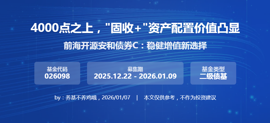 2026年到了,最近A股行情确实让人兴奋,但兴奋之余更多的是纠结,毕竟“连阳”天数已经打破了多年的记录。是追高还是再等等?我觉得有不少人都有这样的心态吧?其实除了感同身受之外,我还是进行了一定的思考,我觉得在当前市场环境下,“固收 ”资产尤其是二级债基,其配置价值正在进一步提升,而正在募集期的前海开源安和债券C(026098),就是我近期锁定的目标。(自选图在文末哦)