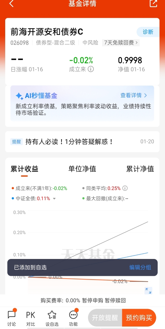 大A已经处于相对的低点了,那是不是应该马上梭哈权益呢?No,no,no.投资有风险,梭哈需谨慎。投资是反人性的,千万不要冲动,不要幻想一夜暴富,要不然容易一夜暴负。现在仍然要结合自身的风险承受能力,科学合理的配置资产。科学合理的配置债基是对自己的负责,是让自己可以在满是镰刀的市场游刃有余。但债基是分散风险降低整体波动的工具,不是百分百提高收益的方法,请科学看待。$前海开源安和债券C$