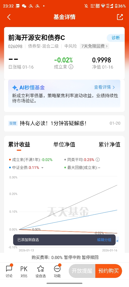当下市场环境中,央行释放流动性信号,债市资金面宽松对固收投资形成利好,而股市低估值红利资产也迎来布局窗口,前海开源安和债券C的“固收+红利”策略正好踩中了这一节奏。如果大家厌倦了追涨杀跌的疲惫,不想让辛苦钱在震荡中缩水,又不甘于只拿微薄的固定收益,那么这只基金值得放入自选细细研究。毕竟投资的终极目标,不是追求一时的暴利,而是在可控的风险下实现资产的稳步增值,而前海开源安和债券C,正是为这份“安心增值”而来。@前海开源基金