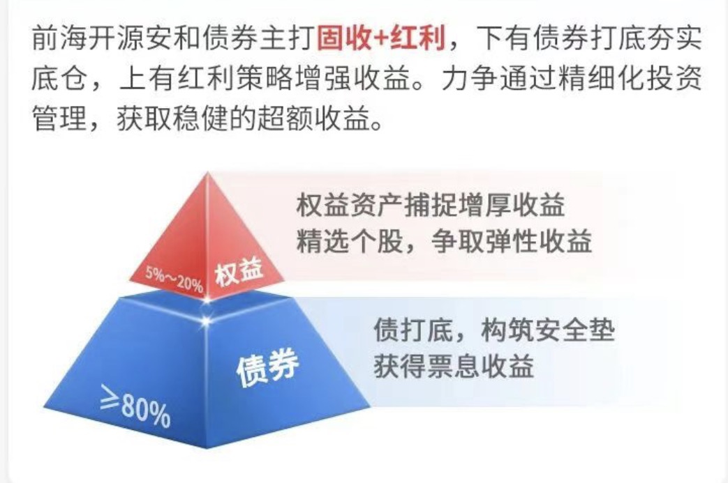 道理虽好,但产品琳琅满目,具体该如何选择?关键是要找到那些真正践行“稳字当头”理念的产品。最近,我注意到一只新发的“固收+”基金——前海开源安和债券(A类020697 / C类020698),它的设计思路和策略定位,在我看来,恰好精准地回应了当前震荡市中的投资者需求。