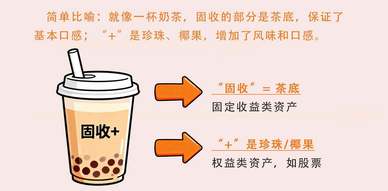 那么,“固收+”到底是什么?简单理解,它就像一份杯你我经常喝的珍珠奶茶。一方面,将债券等固定收益类资产作为底仓,力争相对较平稳的的基础收益。就像一杯奶茶需要挑选红茶、绿茶作为基底,满足食客的解渴需求。另一方面,适度筛选优质个股增强收益。这样既满足了投资者的理财需求,也兼顾了追求长期稳健的投资需求。就像叠加一杯奶茶的口感与体验,放入了脆波波,椰子冻,厚芝士等材料,加料后的奶茶就像点缀了生活趣意,幸福感满满!这类产品的核心目标不是去跟市场指数赛跑,而是追求“绝对收益”——力争在任何市场环境下都实现正回报,尤其适合厌恶大幅波动、又希望资产能稳步增值的普通投资者。