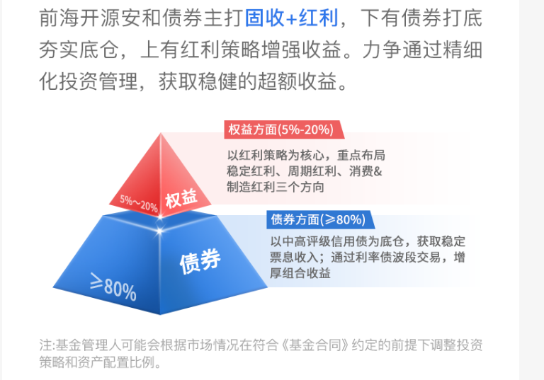 1. 策略设计:满仓固收+红利,双轮驱动稳增长$前海开源安和债券C(OTCFUND|026098)$的资产配置以“债券为主、红利为辅”为核心,通过动态调整股债比例,力争在控制回撤的同时捕捉超额收益。具体来看: