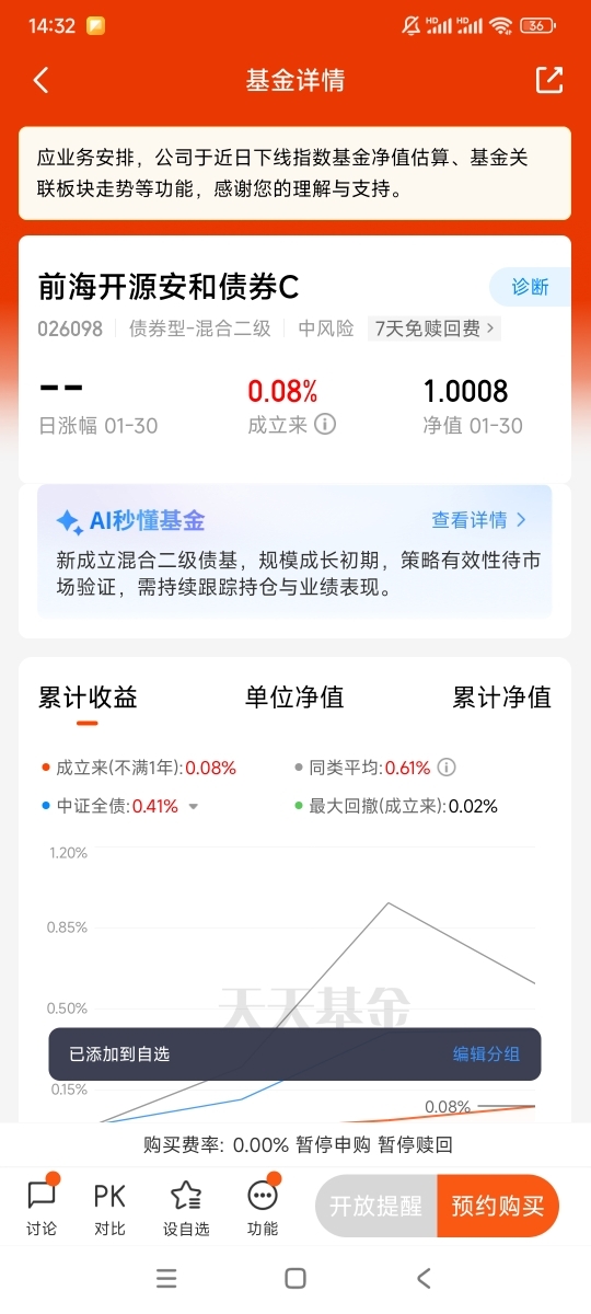 2026年,我依旧坚持走稳健理财路线,以便能够适应股市上涨或下跌等各种行情,最终收获稳稳的收益。同时也建议新手朋友们优先配置低风险的$前海开源安和债券C$ 基金,同时不断学习理财知识,逐步提升自己的理财技能。
