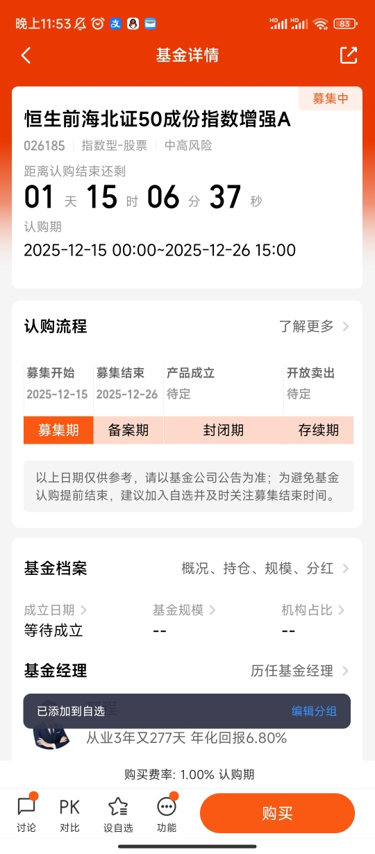 对于大多数普通投资者来说,北交所的投资门槛曾是一道鸿沟。直接买卖北交所股票不仅需要较高的资金门槛,更要面对个股波动大、研究难度高的问题。很多人明明看好专精特新企业的前景,却因为缺乏专业知识和足够资金,只能望而却步。而恒生前海北证50C恰好解决了这个痛点,它的C类份额设计堪称"平民友好型":免申购费,持有7天以上还免赎回费,管理费加托管费也保持在较低水平,10万元投资一年下来,能比不少同类基金节省数百元费用 。更重要的是,它没有限购限额,手头有闲钱就能投,几百元也能参与,让普通人不用凑大额资金,也能实现对北证50指数的布局。