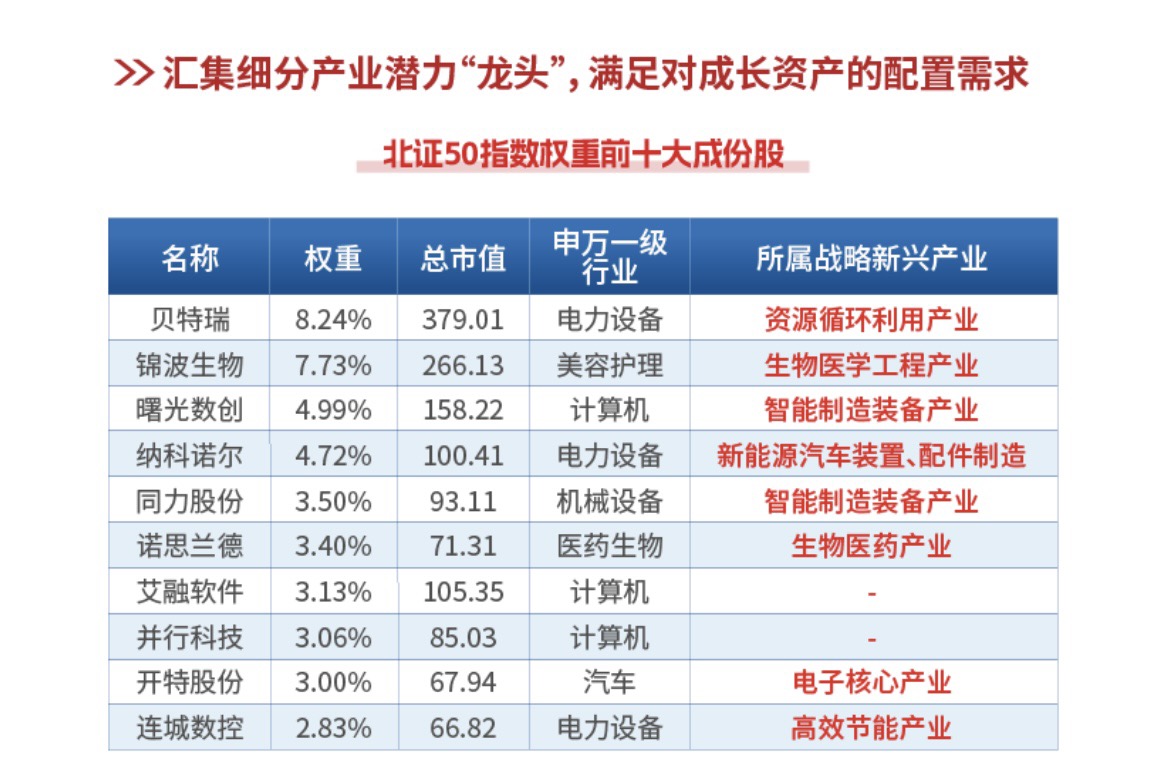 先说说北证50指数本身,这可是北交所的“标杆”指数,代码899050,由北交所规模大、流动性好的50只上市公司证券组成,成分股以新兴产业为主,是专精特新新标的占比最高的小盘指数。从数据来看,北证50指数的50只成份股里,专精特新企业就有28只,在样本数中的权重占比达56%,国家高新技术企业更是有38家,占比高达76%,这个比例远高于其他可比指数,专精特新的属性特别突出。要知道,专精特新企业是中国制造业的“隐形冠军”,聚焦于细分领域的创新与突破,在政策扶持和产业升级的大背景下,这些企业的成长空间不可限量。而且北交所本身就聚焦“专精特新”,和沪深交易所服务的企业类型形成差异化,这也让北证50指数有了独特的成长基因。今年以来,北证50指数的表现更是亮眼,年初以来涨幅达到37.43%,大幅超越科创50、上证50、沪深300等主流指数,领先优势一目了然,这样的业绩表现,足以证明其背后资产的强劲活力。
