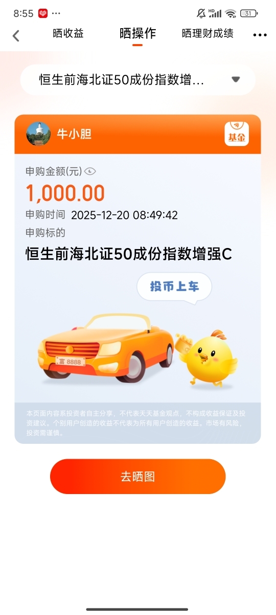 当下北证50的行情远未结束,政策红利持续释放,资金持续流入,核心成分股的成长逻辑也没有发生变化,仍处于估值和业绩双升的黄金时期。对于普通投资者来说,与其纠结如何突破门槛、如何选股,不如选择恒生前海北证50成分指数增强基金C(026186),一键布局核心资产。我已经申购底仓,后续会设置每月定投,长期坚持持有,我坚信,随着北交所的不断发展壮大,北证50的投资价值会持续凸显,而这只兼具便捷性、收益弹性、专业保障的基金,必然能帮我把握这轮北交所的红利,实现资产的长期增值。