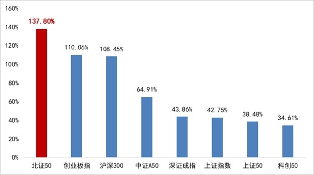自2024年“924”行情启动以来,A股市场迎来了一轮以科技成长为主线的结构性牛市,各类热点板块轮番演绎,但论及涨势最迅猛、弹性最充足的宽基指数,北证50无疑是当仁不让的“领跑者”。截至2025年12月,北证50指数自“924”行情以来累计涨幅高达137%,大幅超越同期科创50(涨幅68%)、沪深300(涨幅19%)、创业板指(涨幅41%)等主流指数;2025年以来,该指数继续乘势而上,屡创历史新高,年初至今涨幅超37%,其“能涨抗跌”的特质与突出的赚钱效应,吸引了海量资金的高度关注。