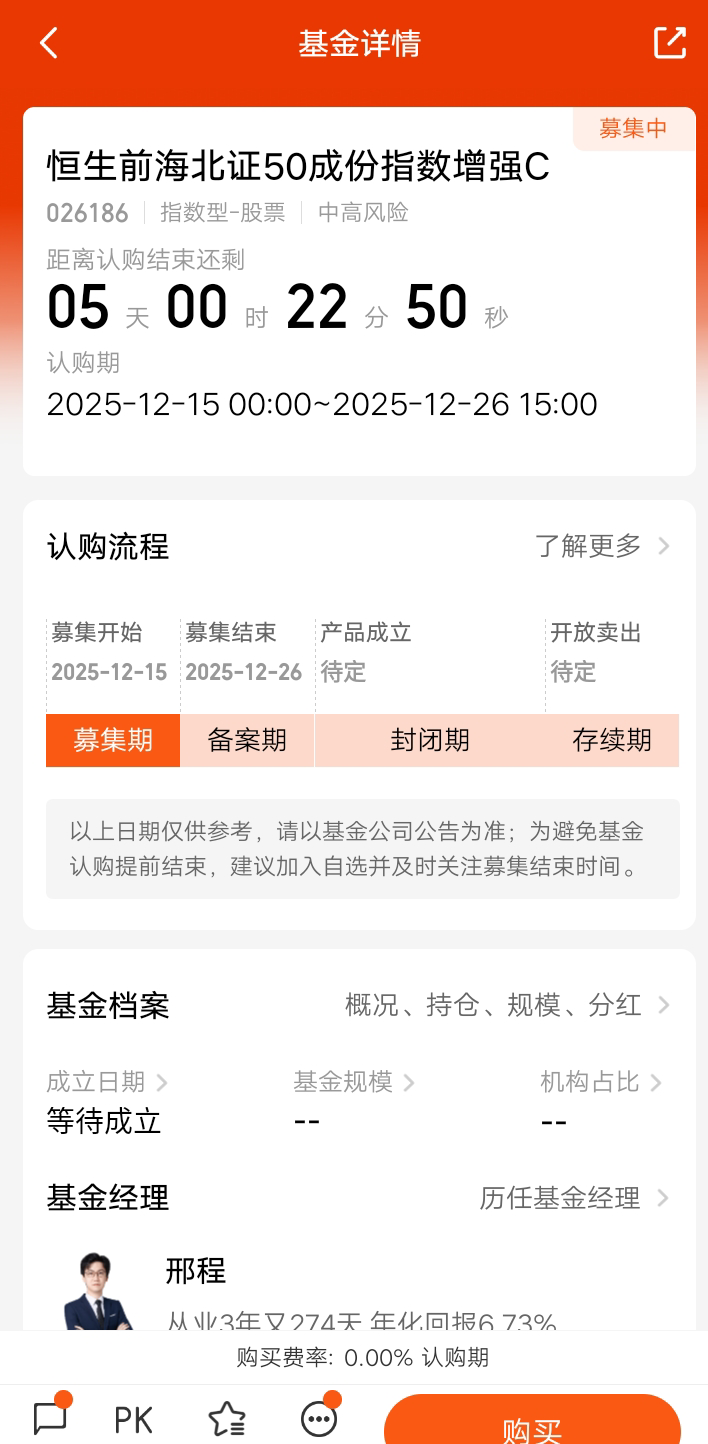 $恒生前海北证50成份指数增强C$是一支处于认购期的基金,拟任邢程、龙江伟为基金