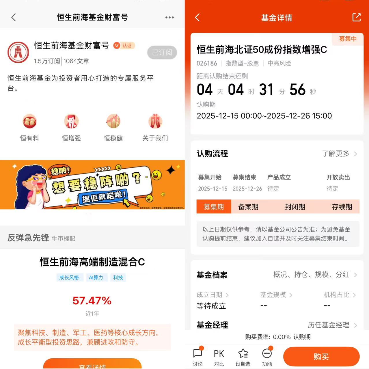 这只基金分A类(代码026185)和C类(代码026186)。简单来说,如果你计划长期持有(通常一年以上),选择A类份额,因为它收取认购/申购费,但不收销售服务费;如果计划中短期投资,选择C类份额更划算,因为它免认购/申购费,仅按日计提少量销售服务费。@恒生前海基金