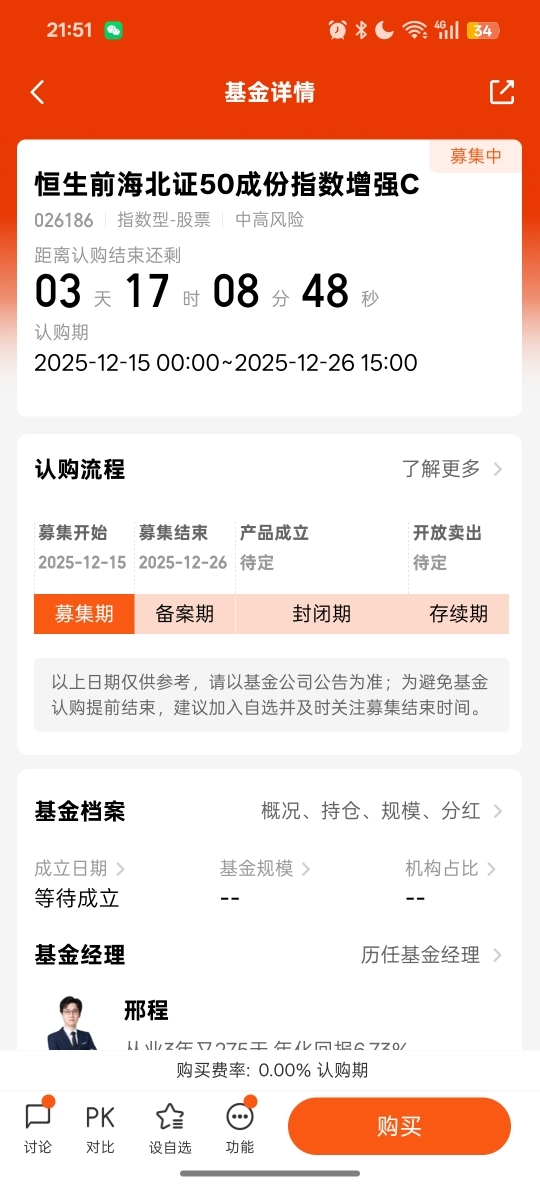 $恒生前海北证50成份指数增强C$ 恒生前海北证50成份指数增强基金跟踪的是北证50指数,其中超过半数的成分股都是国家级“专精特新”小巨人。这些企业是高端制造、新能源、生物医药等新质生产力赛道的“隐形冠军”,研发实力突出,成长确定性高,完美契合国家创新驱动战略。而且这只基金还有增强策略,力求在指数收益之上创造超额回报。C类份额的设计也非常友好,对于这种波动大的指数来说很有必要,交易起来更方便了。@恒生前海基金