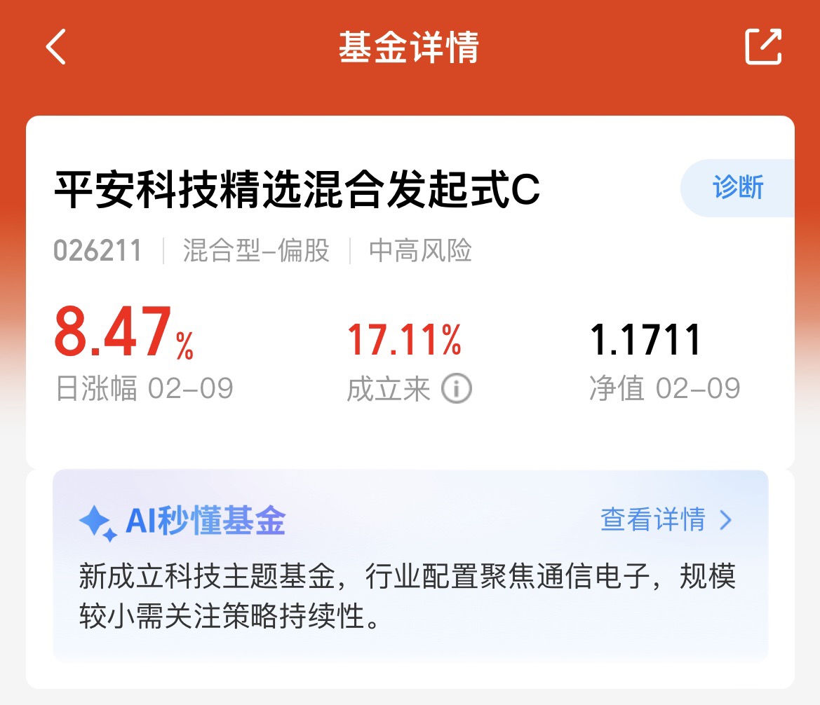 市场还是挺不错的,不过CPO还是逻辑硬、实力强,$平安科技精选混合发起式C$ 昨天大涨8.47%早盘看了下估值,今天又是0.77%的估值涨幅,$浦银安盛数字经济混合C$ 今天估值0.42%,$大摩数字经济混合C$ 估值0.34%,逢低加仓,长期看好$平安中证卫星产业指数C$