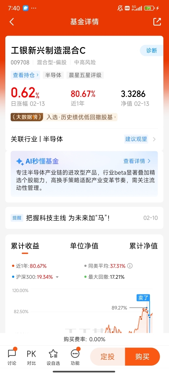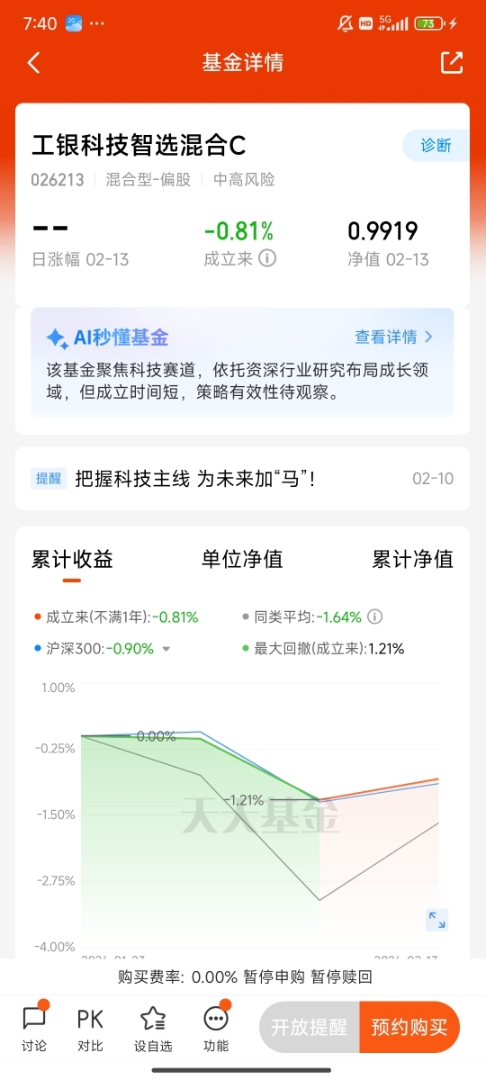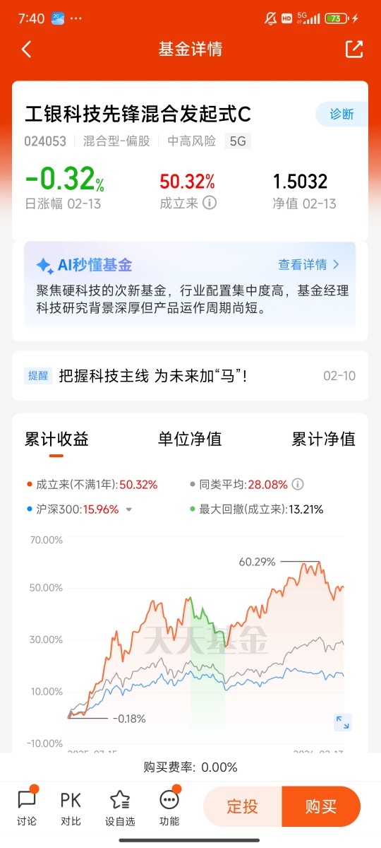 接下来我聊聊工银科技智选混合C这只基金。它是偏股混合型基金,核心投向就是科技赛道,重点聚焦AI应用、半导体、信息技术、高端制造这些高研发、高成长的领域,股票仓位灵活,还能布局A+H两地市场,选股范围更广。基金由工银瑞信科技团队管理,依托公司成熟的投研体系,在科技成长领域有长期积累,风格偏稳健成长,不盲目追热点,更看重公司的基本面、研发能力和商业化前景。作为C类份额,它适合短期或中期持有,费率结构对普通投资者更友好,没有申购费,持有一段时间后赎回费也较低,进出更灵活。