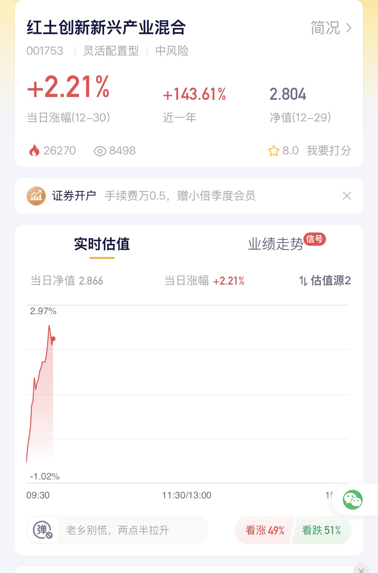 $红土创新新兴产业混合C$ 红土创新新兴产业混合(001753)近一年同类排名市场第1,但社区里讨论的人不多,算是宝藏基金了。今天盘中估值2.21%,CPO板块一反弹它就跟上,敏感度很高。刚看到出了C类代码026245,免申购费很适合当前做波段。感觉这波算力基建行情还没完,提前布局等2026年春季躁动,应该能吃口大肉。