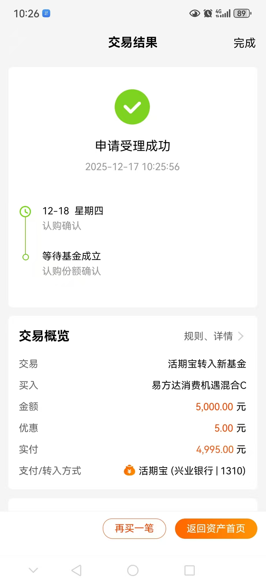 我选择易方达消费机遇混合C (026252),今天建仓5000元。