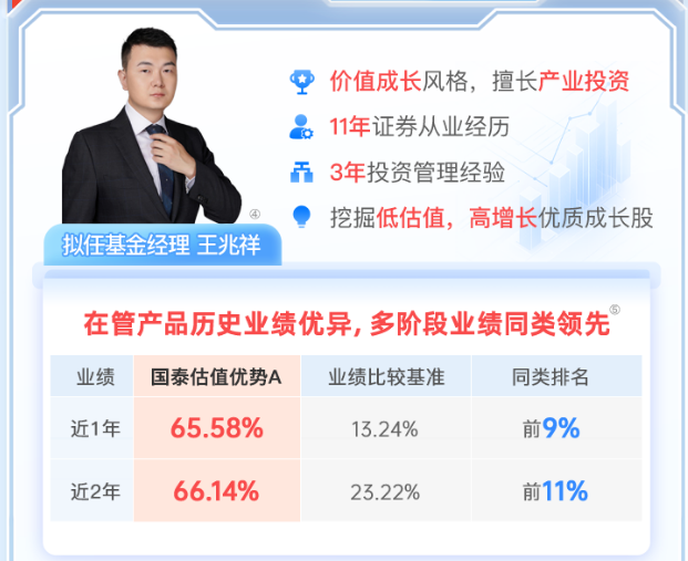 再看他的代表作国泰估值优势A,近1年业绩在同类里排前9%,近2年排前11%,这可不是靠运气能做到的,多阶段都能保持拔尖业绩,说明他的投资体系很成熟,选股眼光也靠谱。更关键的是,这款新基明确说了要重点关注机器人产业的发展机遇,王兆祥本身深耕制造领域,对这类科技成长赛道的理解肯定比普通投资者深,由他来管理,相当于把我们的钱交给了懂行的人,比自己瞎买股票踏实多了。